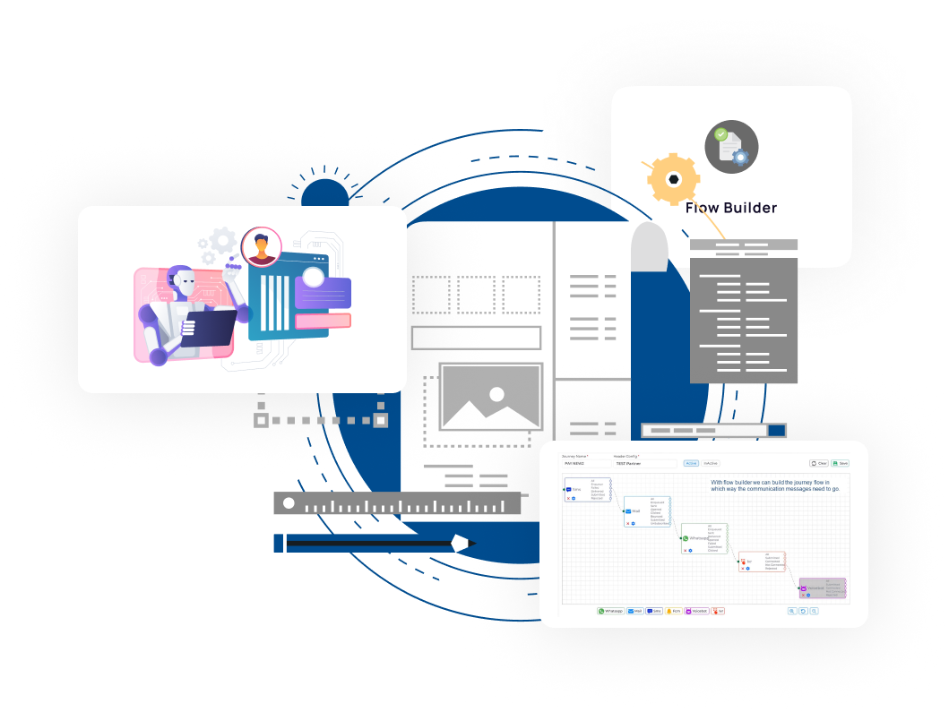 Design customer journeys across multiple channels like SMS, Email, WhatsApp, IVR, and more — all through an intuitive visual interface.